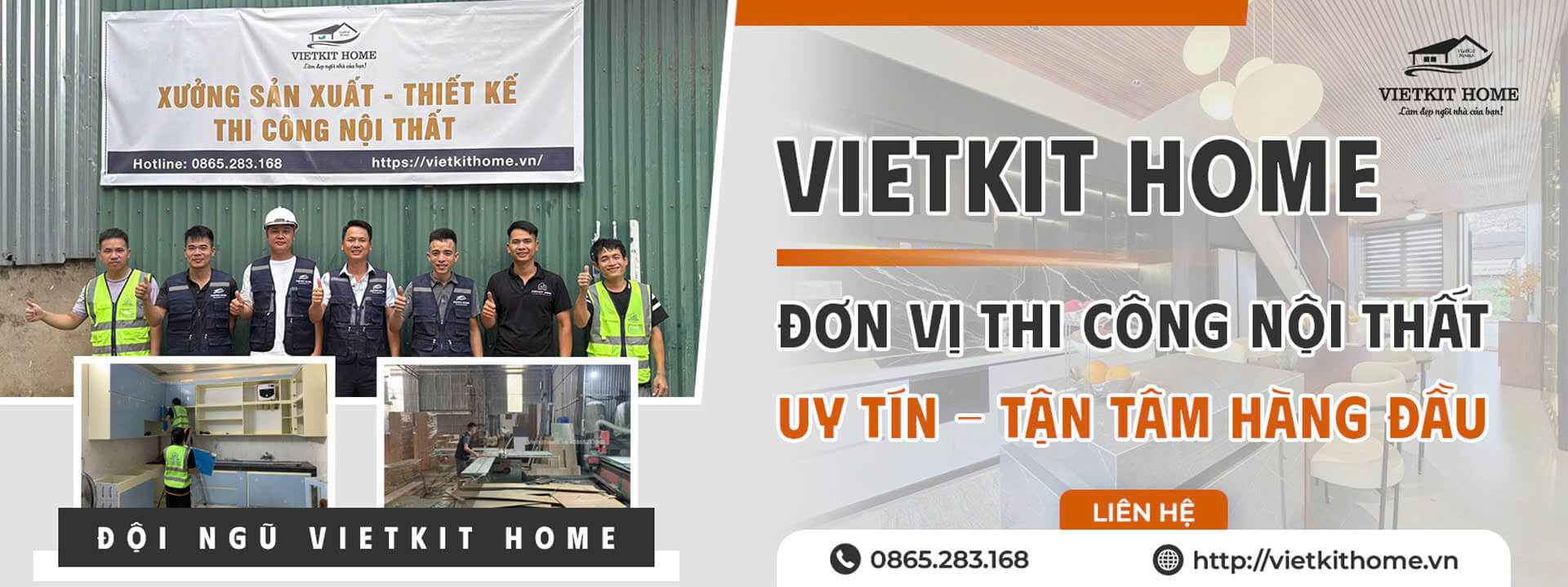 Vietkit Home là đơn vị chuyên thiết kế và thi công nôi thất trọn gói với hơn 10 năm kinh nghiệm, đã thực hiện hơn 600+ công trình trên toàn miền Bắc. Sở hữu xưởng sản xuất 1500m2 tại Thanh Đa – Phúc Thọ – Hà Nội, chúng tôi tự tin mang đến cho bạn những giải pháp nội thất tuyệt vời và không gian sống đúng với mong muốn của bạn. Không cố gắng rầm rộ hay ồn ào, tôn chỉ của chúng tôi là “tĩnh lặng và miệt mài” để làm đẹp cho đời, làm đẹp cho người. Với nhiều năm kinh nghiệm, chúng tôi hiểu chi phi và chất lượng là 2 điều mà quý khách hàng quan tâm nhất. Chính vì vậy, việc sở hữu xưởng sản xuất riêng, cam kết không qua trung gian, không đội giá, tăng chi phí là một trong những điểm mạnh của chúng tôi… Đồng thời, vẫn sẽ đem lại sản phẩm hoàn thiện ở mức cao nhất.